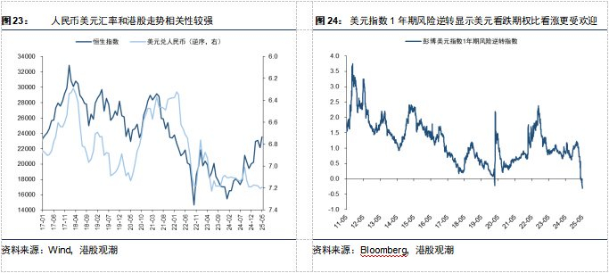 国际秩序重构和中国资产重估,将驱动港股长牛。虽然在“去美元化”的过程中,可能伴随着美国股债汇的波动率上升,也会阶段性波及香港资产价格,但在香港基本面趋稳、资金结构性流入的背景下,香港市场的相对稳定性会更好。当前外汇期权交易员对美元未来一年看法显示(彭博美元即期指数的1年期风险逆转),美元贬值比以往都更加悲观。