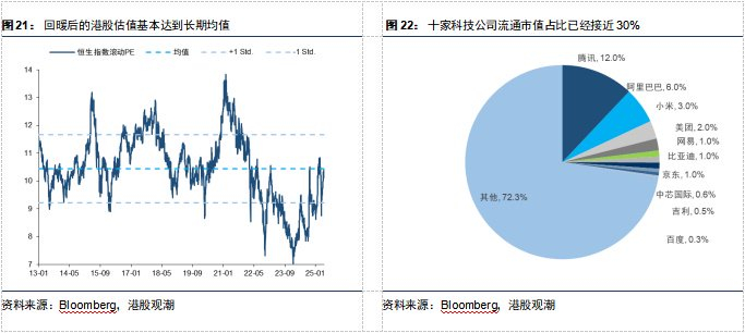 但每一次危机,都伴随着机遇。在流动性冲击后,如果不是系统性的基本面和资产负债表杠杆问题,短期兜住了流动性冲击的蔓延,则会带来更好的反弹机会。特别是恒生指数当前动态PE在10倍左右,在全球依然是估值洼地。在2018年港交所改革后,港股在结构上获得了极大改善。目前消费+科技在港股市值已经占到了半壁江山,中国10家科技巨头公司(阿里、比亚迪、中芯国际等)在港股流通市值占比已经接近30%。港股估值生态的重塑,也是对中国科技发展历程的见证,未来随着中国科技继续蓬勃发展,“硬科技+新消费”成长板块依然是内外资配置港股的核心资产。