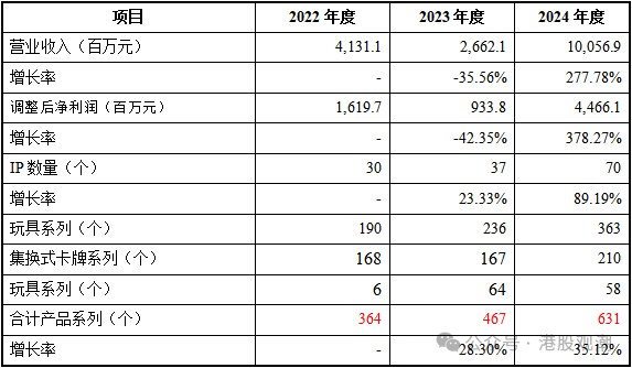 从公司的招股说明书来看,卡游公司的营业收入在2024年度成功突破百亿,达到了100.57亿元,同比增长277.78%。同时公司调整后的净利润亦从报告期初的16.20亿元增长至2024年的44.66亿元,增长幅度高达378.27%,整体业务在2024年度显示出强劲增长势头。港股观潮认为这一增长主要得益于公司报告期内IP数量的增加及产品体系的丰富。