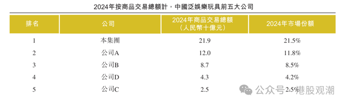 卡游是中国领先的泛娱乐产品(泛娱乐产品是基于IP开发的实体产品,如玩具、文具、服装及其他消费品等)公司之一,公司致力于提供高质量、富有趣味性和互动性的产品,为消费者群体带来快乐和正能量,并且以核心IP为中心打造产业化产品,构建强大的市场壁垒。根据灼识咨询数据,按2024年商品交易总额计,卡游在泛娱乐产品行业及泛娱乐玩具行业中排名第一,市场份额分别为13.3%和21.5%。
