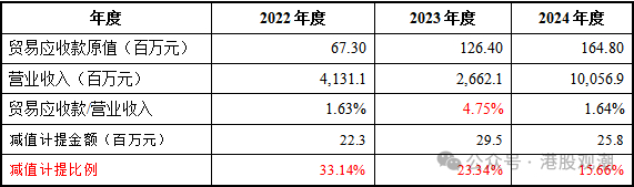 同时港股观潮发现公司的应收账款的坏账计提比例却是在报告期内呈现逐年下降的态势。报告期内公司坏账计提比例分别系33.14%、23.34%及15.66%,2024年度相关比例大幅下降,在公司营业收入及应收账款大幅提升的情况下,公司坏账计提比例却逐年下降,这亦不符合正常商业逻辑。并且公司坏账计提比例远高于正常的商业往来,以公司2022年度的减值计提情况来看,减值比例高达33.14%,也就是说公司预估将近有1/3的应收账款无法收回。