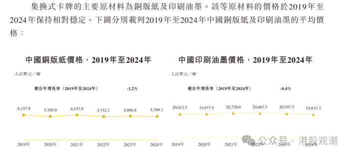 并且港股观潮亦发现公司的材料成本波动的财务数据亦与招股书的业务部分描述产生背离。根据公司招股书披露,报告期内公司直接材料成本占销售成本的比重分别为72.4%、59.9%及58.9%,呈现逐年下滑的趋势。首先对于公司的集成式卡片来说,其材料成本总体来说应是不会有大幅度变化的,因此其材料成本占销售成本的比重应当是总体保持稳定的态势,但公司财务数据却呈现出逐年下滑的趋势,这本身就不符合商业逻辑。其次港股观潮发现,公司招股书在业务部分说明了公司的集换式卡牌的主要成本系铜纸板及印刷油墨,而相关原材料价格总体保持稳定,并未出现大幅度的下降。那么在整体行业采购价格的稳定情况中,公司的材料成本占比却逐年下滑,这亦形成了财务数据与行业数据的背离。