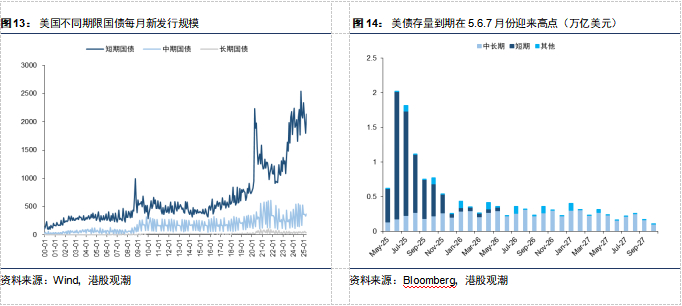 不过,目前全球流动性危机的引爆点并不在美国。特朗普的“大漂亮法案”(《One Big Beautiful Bill》)通过在即,美债上限问题得到短暂解决后,美国财政部可能在7-9月集中投放新增美债,美国市场遭受系统性流动性冲击的风险上升,美联储开启QE等扩表政策来救市的迫切性正在提升。这些短期操作能在一定程度上,解决近渴。但目前市场的主线仍在于“大漂亮法案”导致的赤字担忧,将进一步导致美国长端利率快速上行。若美国经济数据继续转弱,长端美债仍面临较大的抛售压力。