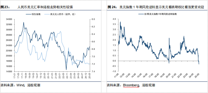 国际秩序重构和中国资产重估,将驱动港股长牛。虽然在“去美元化”的过程中,可能伴随着美国股债汇的波动率上升,也会阶段性波及香港资产价格,但在香港基本面趋稳、资金结构性流入的背景下,香港市场的相对稳定性会更好。当前外汇期权交易员对美元未来一年看法显示(彭博美元即期指数的1年期风险逆转),美元贬值比以往都更加悲观。