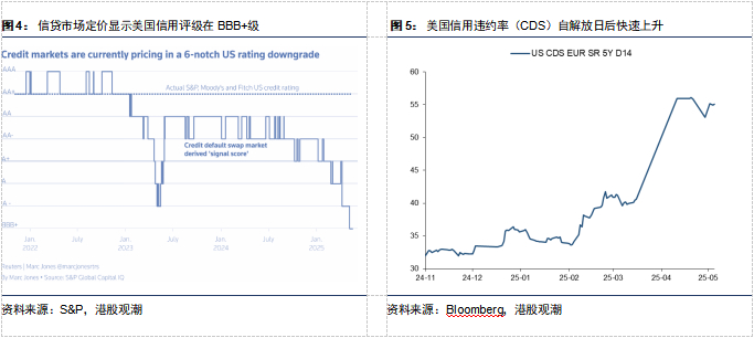 5月16日,穆迪将美国主权信用评级从最高级别的Aaa下调至Aa1,美国失去“最后的AAA评级”。同时穆迪将美国评级展望由“负面”调整为“稳定”,这也让市场重新评估美国资产的风险溢价。目前美国信贷市场信用违约掉期(CDS)定价显示美国信用评级应该比当前要低得多,至少要低6个等级,在BBB+勉强维持投资级水平。虽然围绕美国自行设定的债务上限可能继续引发美国两党的恶行斗争,目前CDS定价可能因为技术性违约风险受到了扭曲,但美国信用受损已经是无法改变的事实。全球的投资者已经开始接受美国债务将以荒谬的速度膨胀,以及不可持续性。但最大的不确定性在于:美债危机将在何时彻底失控?