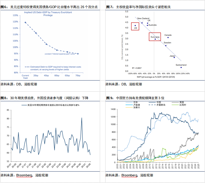 国际投资净头寸(NIIP)可以看作是衡量一国财政空间的最佳指标。如果一个国家欠世界其他国家的钱越多,再继续借更多就越困难。这可以从主权收益率与NIIP之间的紧密关系中看出,远比与财政赤字的相应关系紧密。美国NIIP恶化的当前路径意味着,未来几年美国国债收益率将远高于5%。随着美元失去其部分“特殊”地位,外国投资者愈发意识到这一变化。