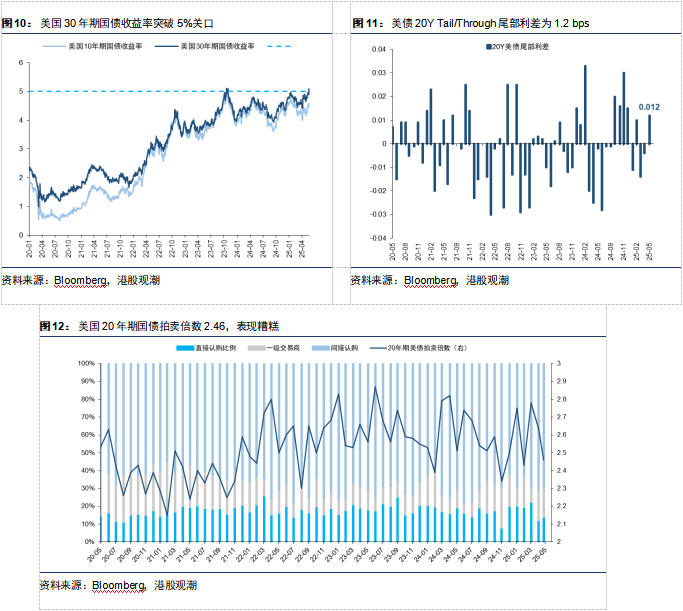 美国20年期国债也创下去年12月以来的最大尾部利差,尾部利差作为中标收益率与预发行 收益率之差,其反映的是美债拍卖结果与市场预期之间的偏离,尾部利差越大越说明市场的需求越低迷。