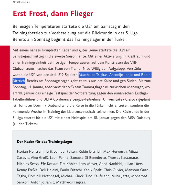 2026年1月5日,据德国斯图加特二队官方最新消息,斯图加特二队正在准备新赛季的德丙联赛,其中4名U19梯队球员跳级晋升到了二队名单。据了解,这4名球员分别为前锋MatthaiosTsigkas、右后卫AntonijoJanjic、门将RobinDittrich、U19队长Yanik Spalt。与此同时,18岁中国球员谢初筠也有希望在新赛季升级到二队,从而跳级踢德丙联赛。