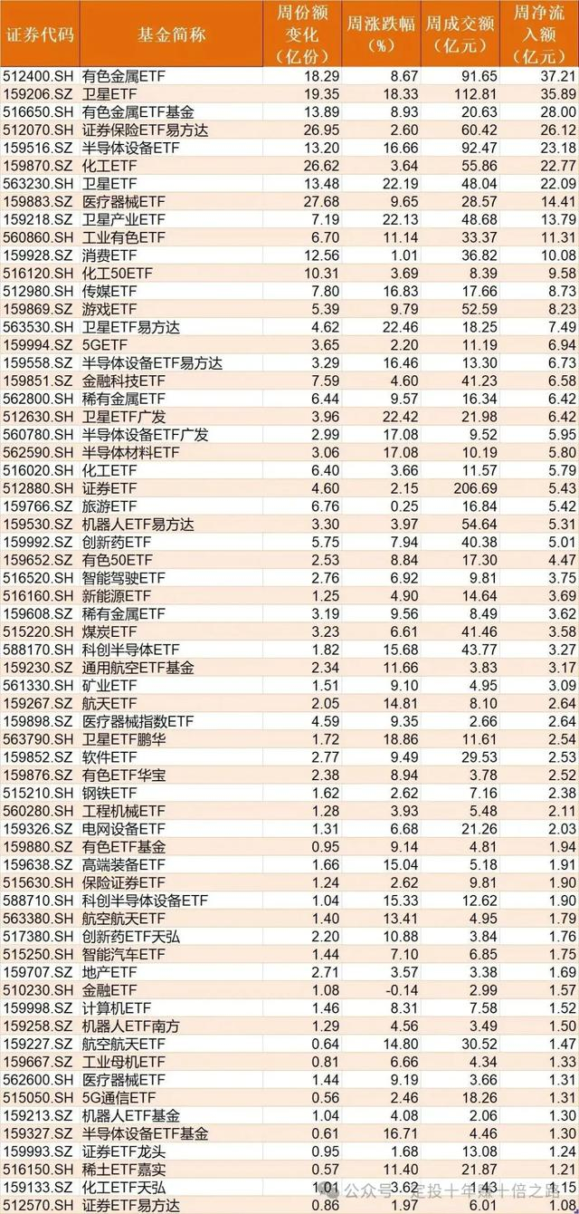 在行业主题ETF方面,本周有色金属ETF、卫星ETF和有色金属ETF基金分别净流入资金37.21亿元、35.89亿元和28亿元。