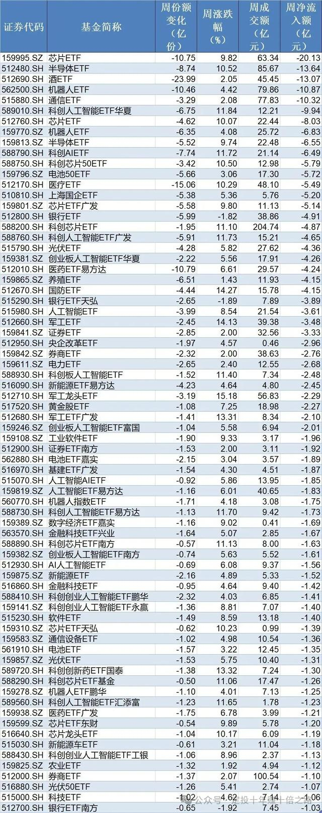 在资金流出方面,本周芯片ETF、半导体ETF和酒ETF分别净流出资金20.13亿元、13.64亿元和13.07亿元。