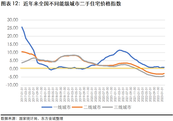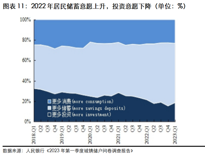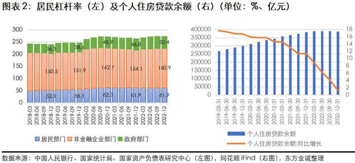 随着各地需求端利好政策的出台,住房贷款加权平均利率从2021年末的5.63%持续下降至2022年末的4.26%,但在房地产市场价格普遍横盘或走弱、理财产品收益率普遍下降以及收入预期转弱影响下,居民购房观望情绪较高,去杠杆意愿有所抬升。根据国家资产负债表研究中心的数据,2022年末,居民整体杠杆率维持在2021年末的61.9%,同比未发生变化,分季度看,四个季度增幅分别为-0.1、0.2、0.1和-0.2个百分点。单从债务端来看,居民债务全年增长5.4%,相比非金融企业部门债务增速9.8%和政府部门债务增速13.6%,增速最低;其中个人经营性贷款保持16.5%的较高增速,其他消费性贷款增长2.8%,住房贷款仅增长1.8%。2022年以来,各季度末个人住房贷款规模同比增速自2011年以来首次降到10%以下且各季度增速持续放缓。