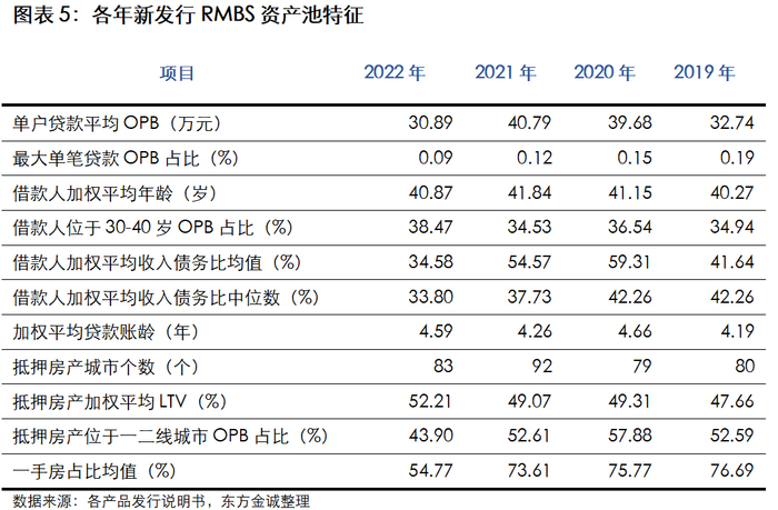 因新发单数少,2022年新发行产品资产池指标受单产品资产池指标影响较大,相较历史年份水平,抵押房产加权平均LTV有所上升,借款人加权平均收入债务比和抵押物所在一二线城市OPB占比有所下降