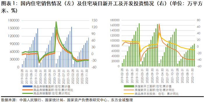2022年以来,为防范行业系统性风险,中央及各地政府年初在需求端推出放松限购限贷、下调首付比例等系列维稳利好政策,但受前期“三道红线”、“银行贷款集中度管理”等融资强管控政策传导滞后影响,叠加多地疫情反复,宏观经济下行压力增加,房地产行业景气度持续下行,融资端投资者风险偏好低位,部分房企自身造血能力不足,出险房企增加。11月份以来,地产利好政策密集出台,在供给侧陆续推出银行信贷支持、债券融资支持和股权融资支持的“三支箭”,用于房企流动性纾困和满足合理融资需求,同时通过政策性银行专项借款、专项借款配套融资等措施实现“保交楼”;需求侧鼓励各地方因城施策继续松绑限购限售,合理确定个人住房贷款首付比例和贷款利率政策下限,推动刚性和改善性住房需求恢复。上述政策的出台,极大提振市场信心。但政策落地到效果实现需要时间,且在宏观经济增速放缓及人口负增长带来的人口红利消失背景下,居民收入预期弱,年中多地期房“停工断贷”进一步打压购房信心,压抑中长期购房需求,需求仍有待修复。