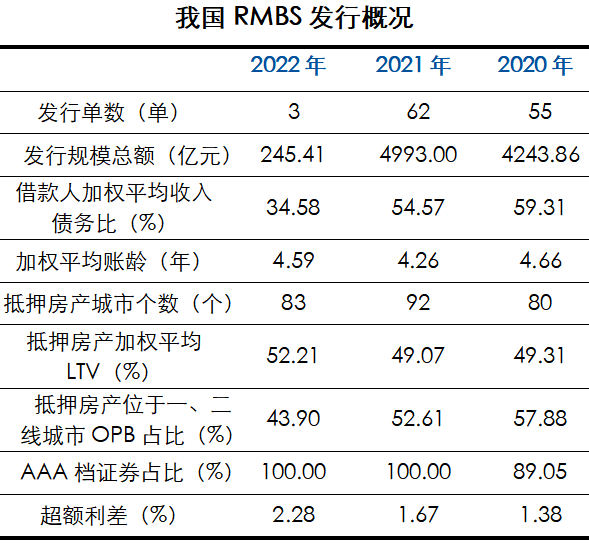受房地产市场成交下降、个人住房贷款增长放缓等因素影响,2022年全年仅工商银行、中国银行和中国邮政储蓄银行三家全国性国有银行于1季度共发行3单RMBS产品,发行总规模245.41亿元,发行单数及规模均创2015年以来的新低。