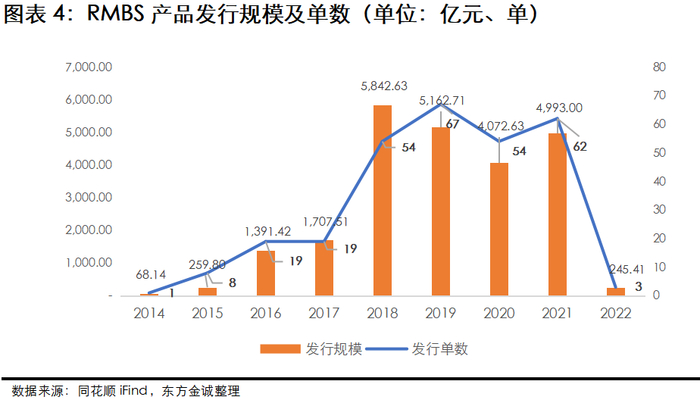 产品发行:受住房贷款投放供给不足的影响,2022年RMBS发行单数及规模均创2015年以来的新低,新发产品超额利差上升。
