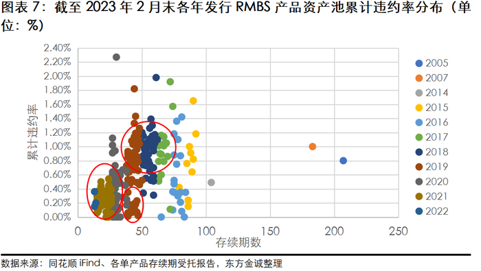从不同年份发行产品来看,2017年以来发行的RMBS产品整体较之前发行产品累计违约率增速整体有所上升,其中2022年新发RMBS产品累计违约率均值和增速均高于以往年份,或受单只产品影响较大。