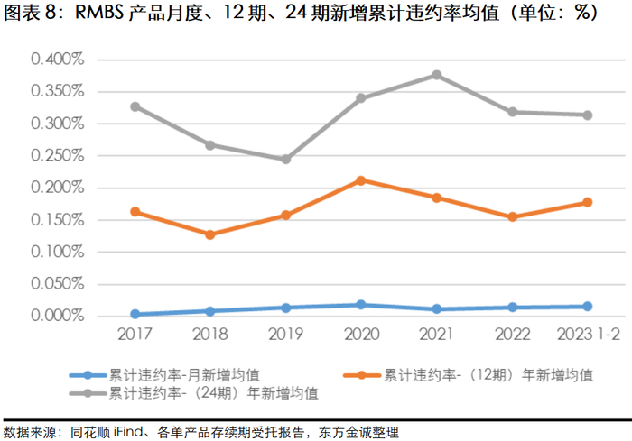 存续期RMBS产品资产池累计违约率维持低位,远低于RMBS次级档占比,新增违约率保持相对平稳,未见受“断供潮”事件明显影响