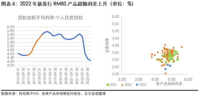2022年新发行产品资产池加权平均贷款利率保持在较高水平,同时受益于适当宽松的货币政策及1季度前市场对经济稳增长的强烈预期,证券端发行利率下降明显,产品超额利差上升