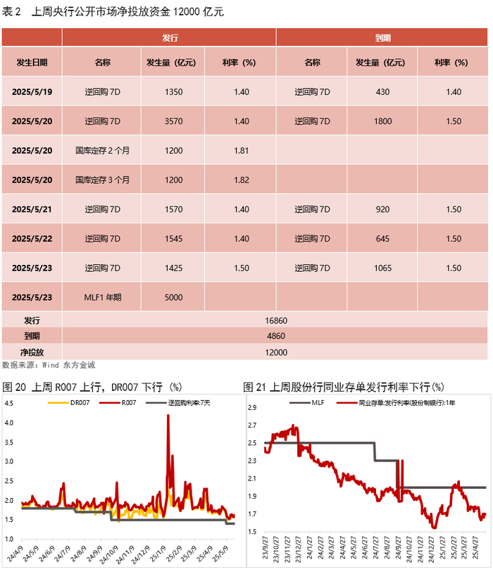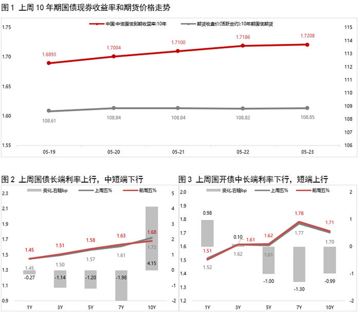 上周债市偏弱震荡,长债收益率进一步上行。上周(5月19日)初,LPR如期调降,叠加大行存款利率下调,债市呈现利好兑现后的先扬后抑走势。随后,受资金面反复,50年特别国债发飞,股市走弱等多空因素扰动,周三至周五债市维持震荡格局。整体上看,上周资金面反复以及降息落地利好出尽,驱动长债收益率延续上行。短端利率方面,上周央行通过加大净投放力度、放量续作MLF等多途径保障税期流动性,资金面整体较为宽松,推动短端利率小幅下行,收益率曲线进一步陡峭化。