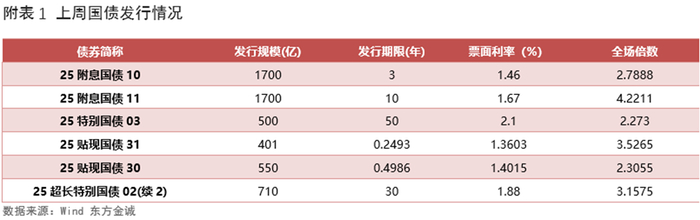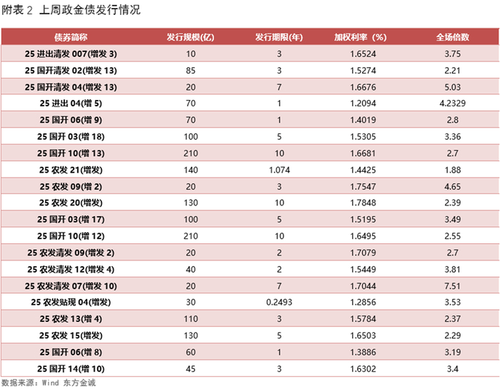 上周利率债认购需求整体尚可:共发行6只国债,平均认购倍数为3.05倍;共发行20只政金债,平均认购倍数为3.39倍;共发行66只地方债,平均认购倍数为21.03倍。(上周利率债发行情况详见附表1-3)