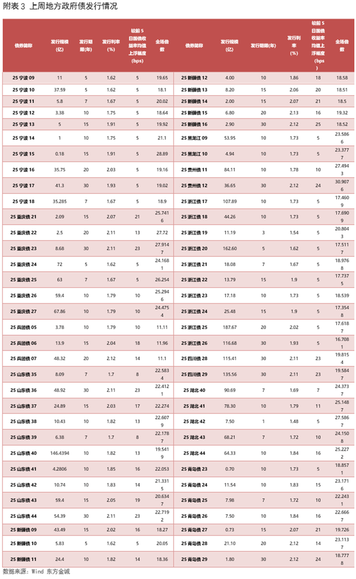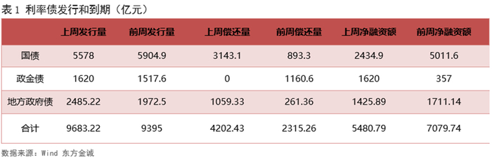 上周共发行利率债92只,环比增加15只,发行量9683亿,环比增加288亿,净融资额5481亿,环比减少1599亿。分券种看,上周国债发行量环比减少,而政金债、地方债发行量环比增加;政金债净融资额环比增加,国债、地方债净融资额则环比减少。