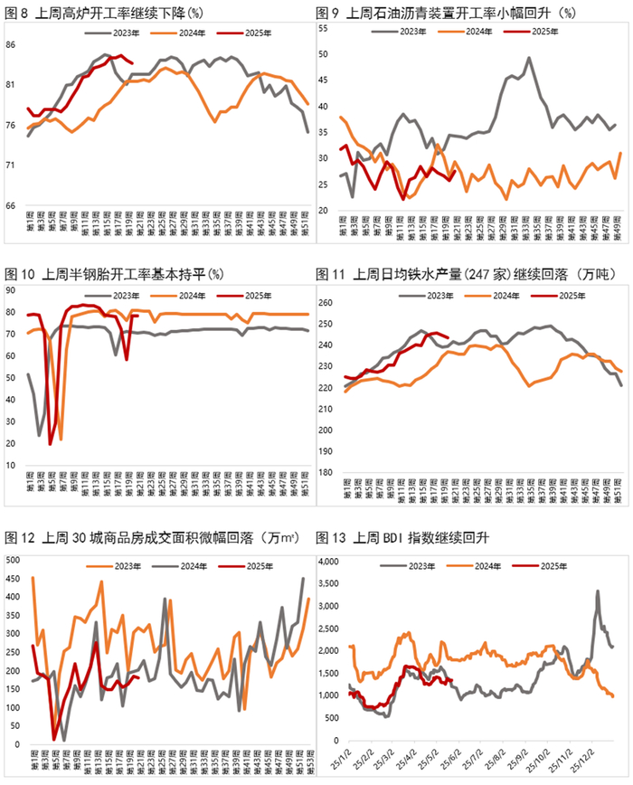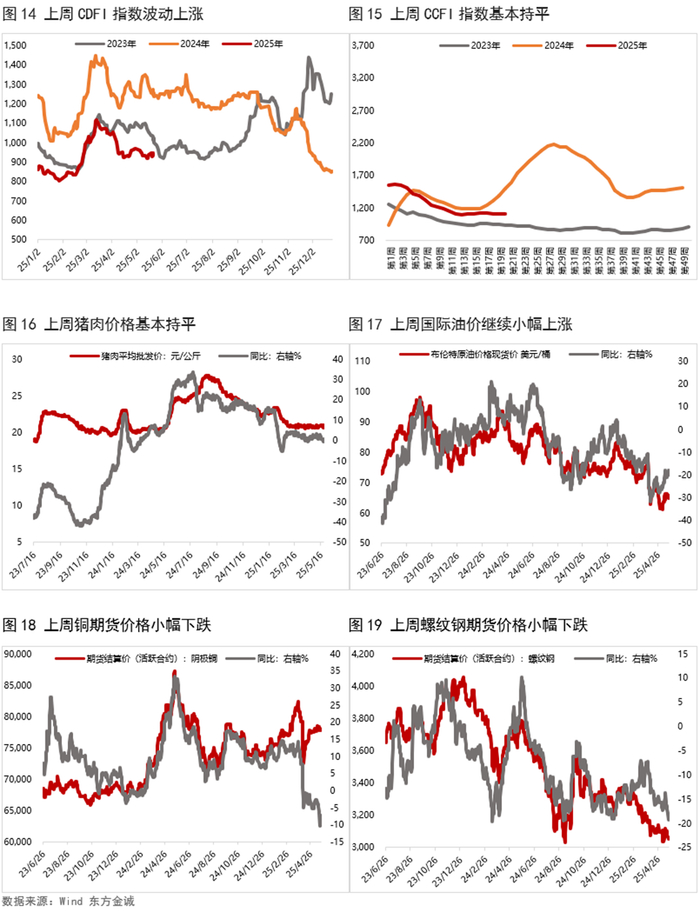 上周生产端高频数据涨跌不一,其中,高炉开工率、日均铁水产量均下滑,而石油沥青装置开工率小幅回升,半胎钢开工率则基本与前一周持平。从需求端来看,上周BDI指数继续回升,而出口集装箱运价指数CCFI基本与前一周持平;上周30大中城市商品房销售面积微幅回落。物价方面,上周猪肉价格基本与前一周持平,大宗商品价格多数下跌,其中,铜、螺纹钢价格均下滑,原油价格则继续小幅上涨。