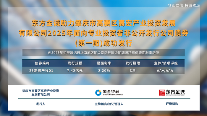 近日,由东方金诚评级的“肇庆市高要区高宏产业投资发展有限公司2025年面向专业投资者非公开发行公司债券(第一期)”(以下简称“本期债券”)在深交所债券市场成功发行。本期债券发行规模为7.42亿元,发行期限为3年,票面利率为2.20%,创2025年初至簿记日华南地区同级别区县国企同期限私募债票面利率新低。