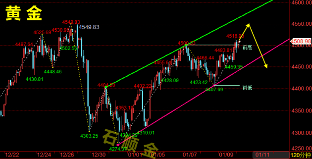 非农数据公布之后,黄金先跌后涨,快速从4475跌至4459一线反弹,直接突破4500的高位,最高触及4517而后午夜回撤至4482低位反抽,周五收盘于4510。而在这么快速的反抽之后,下周做空的点位需要重新调整了,毕竟4500一瞬间就破位了,首先要关注的点位就是上个月27日的最高4549-4550的历史高点关口,再破位站上去下跌就有些奢望了。关注的高点4550历史前高压力去高空即可!