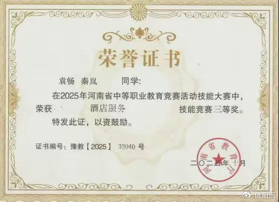 在河南省技能大赛酒店服务赛项的专业比拼中,袁畅、秦岚同学沉着应战,顺利通过礼仪展示、实操服务、应急处理等多轮考核。两人凭借规范的服务流程、得体的沟通技巧和灵活的临场应变,荣获省级三等奖,生动诠释了精益求精的“工匠精神”。
