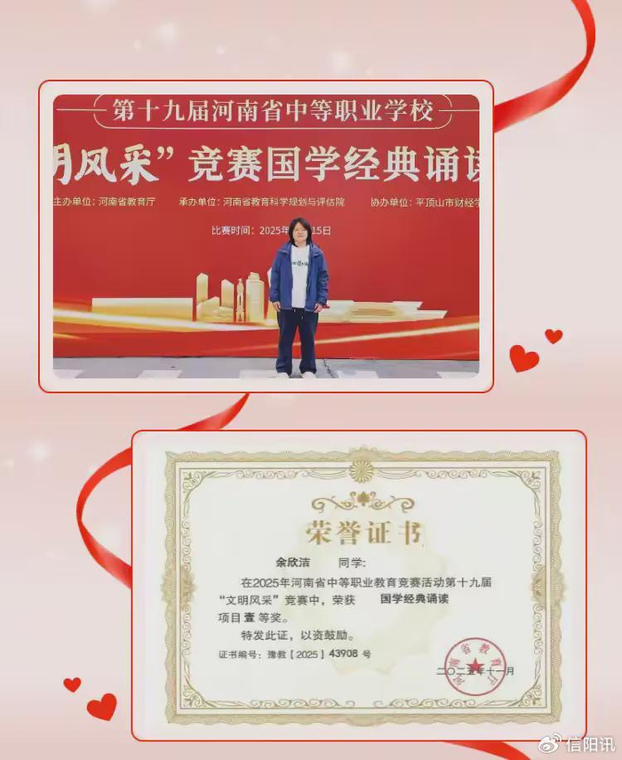 在河南省“文明风采”竞赛的文化素养类赛项中,信阳市第一职业高级中学学子精准发力、捷报频传: