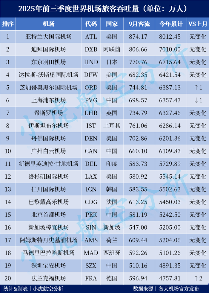 客运量方面,统计2025年前三季度世界主要枢纽机场的数据排名: