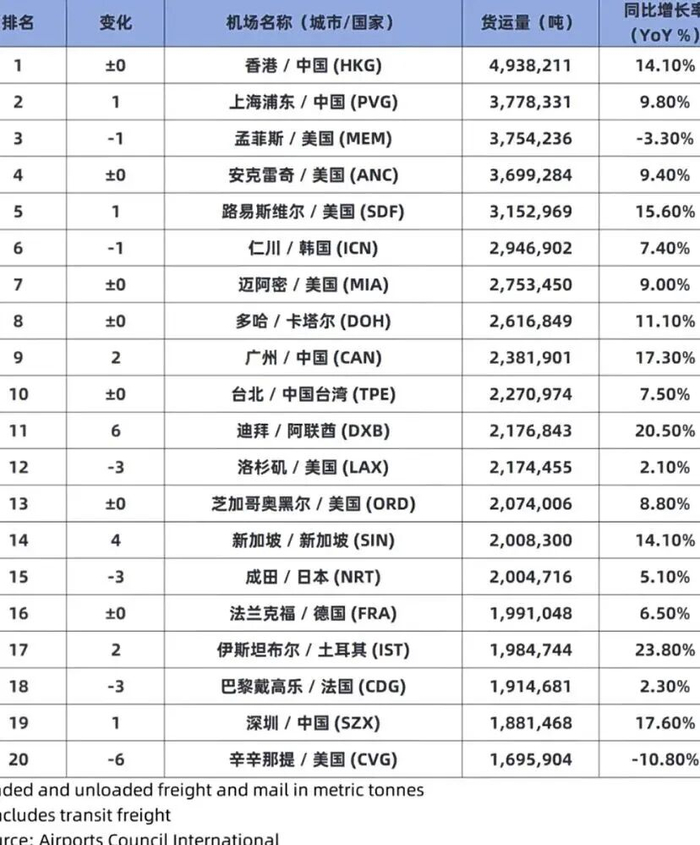 货运量方面,国际机场理事会(ACI)发布2024年全球前20大货运机场排名: