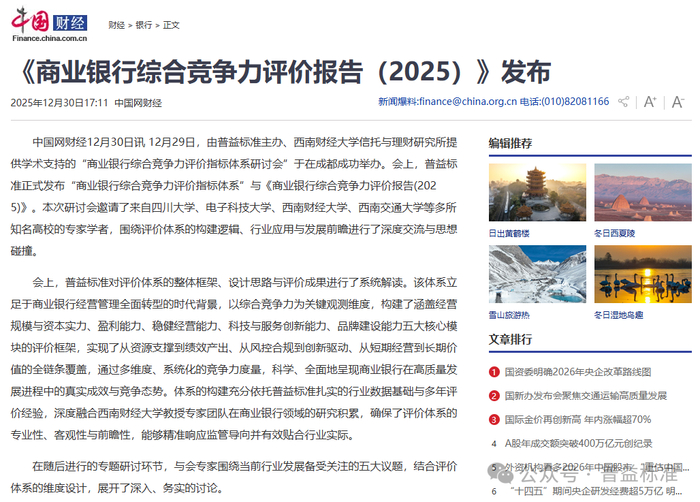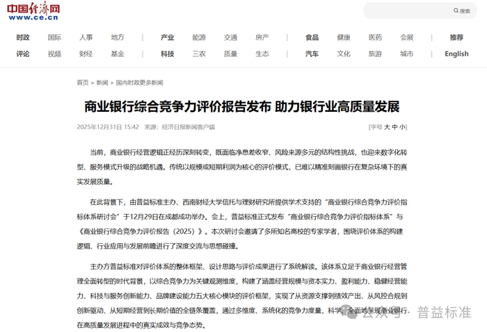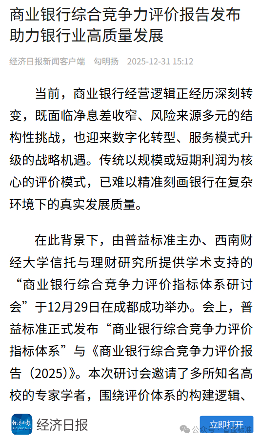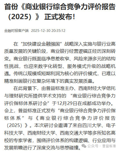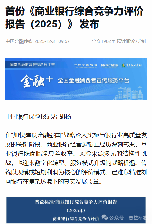 在银行业高质量发展与金融强国建设深度融合的关键节点,普益标准于2025年12月30日正式发布“商业银行综合竞争力评价指标体系”与《商业银行综合竞争力评价报告(2025)》(以下简称《报告》)。