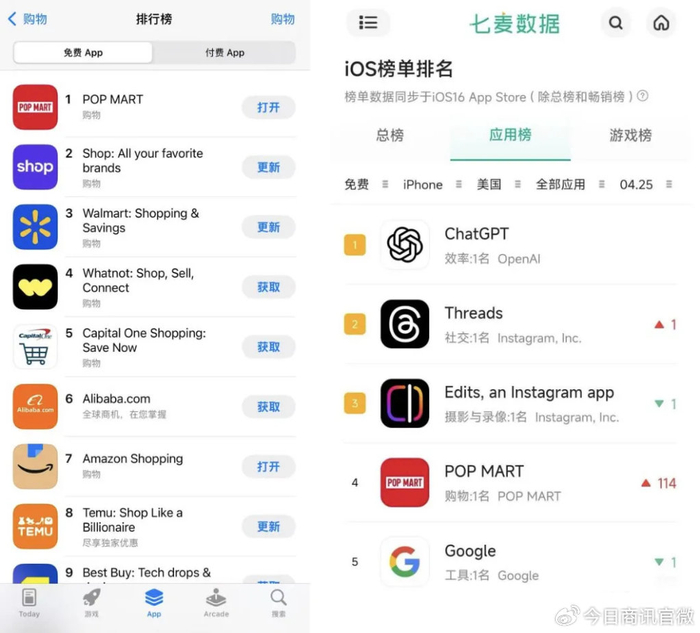 七麦数据显示,4月25日,泡泡玛特APP凭借新品发售攻势,首次登顶美国App Store购物榜,日内跃升114个位次,并连续两天保持第一,同时跻身免费总榜第四名。