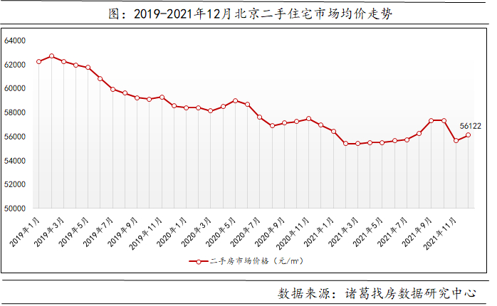 整体来看,2019年以来北京二手房价格整体大致呈现稳步回落态势。进入2021年初,市场延续2020年底成交热度,市场成交高位运行,价格基本呈现小幅上涨局面,4月下旬北京多家银行加大“经营贷“审查,5月二手房价出现短暂回落,下半年北京强化贷款审核力度、出台“多校划片”政策打击学区房炒作、以及海淀区推行二手房指导价等,有利于平抑二手房价过快上涨势头,稳定市场预期,随着政策效果逐渐显现,10月和11月房价呈现下行趋势,12月随着金融面改善市场信心有所提升,价格略有上扬。数据显示,2021年12月北京二手住宅市场均价为56122元/㎡,环比上涨0.86%,同比下跌1.46%。