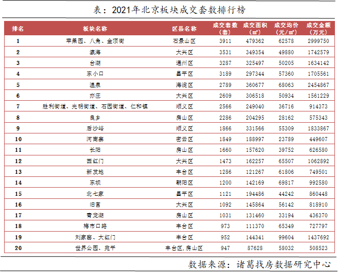 从各大板块的成交来看,大兴、房山和丰台区热门板块聚集较多,共上榜10个板块,其他区域零散分布。其中,石景山区的苹果园、八角、金顶街板块以3911套的成交量占据榜首,当前成交价格在62578元/㎡左右;其次为大兴区的瀛海板块,全年成交3531套,优越的地理位置使瀛海板块成为京南地区重要的交通枢纽,104国道、京台高速、地铁8号线、黄亦路、兴亦路以及市郊铁路线合力搭建的“三纵三横”交通网络,也使得瀛海板块的交通便利度提升,同时,瀛海板块成交均价为49880元/㎡,是大兴区的价格洼地,吸引部分刚需群体来此置业。通州区的台湖板块位居第三,2021年新房成交套数为3287套。