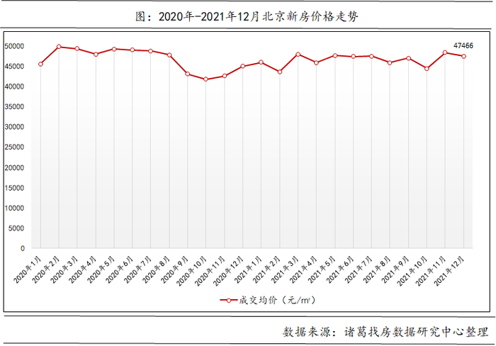 随着近年来北京楼市政策加码不断,新房价格基本保持平稳,受政策调控如禁止违规资金流入楼市和打击“假离婚”限购政策,以及季节性等因素影响轻微波动,但基本控制在45000元/㎡左右,2021年12月,开发商以价换量加速资金回笼,带动房价水平下行。根据诸葛找房数据研究中心监测数据显示,2021年12月,北京新房成交均价为47466元/㎡,环比下跌1.85%,同比上升5.49%。