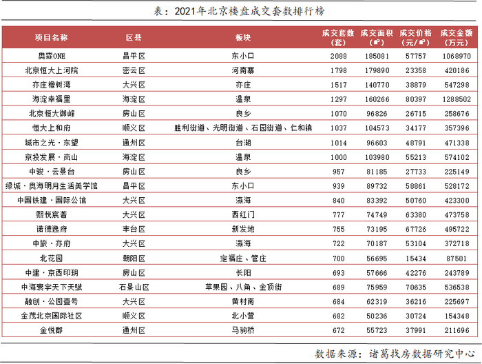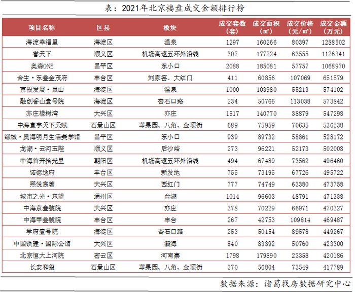 根据2021年北京成交金额TOP20项目来看,2021年北京全市出现3个百亿大盘,其中,海淀幸福里项目以128.85亿元的全年成交额荣膺冠军之位,该项目是由首开、华润置地、北京住总万科、中交地产和北科建集团五大实力房企联袂打造的纯商品房项目,产品力自然不在话下,项目位于海淀区西北旺镇、北清路科创轴与中关村科创轴交汇处,高科技的发展带动区域价值提升,前景可期,同时,项目主打100㎡左右的三居及140-200㎡大面积段的四居,契合改善人群的需求,当前成交价格在80397元/㎡左右。顺义区机场高速五环外沿线板块的誉天下项目位居成交金额第二,全年成交112.63亿元;奥森ONE项目占据第三,2021年成交金额为106.90亿元。