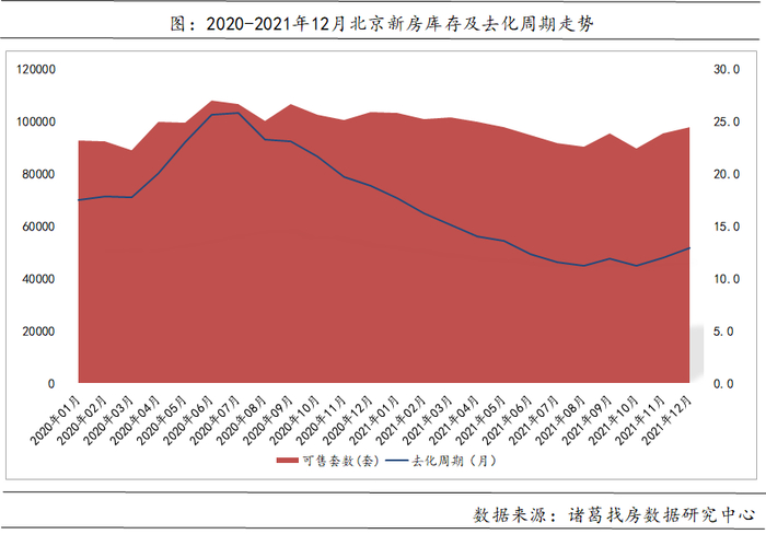 从库存来看,2021全年库存量“先降后升”,上半年由于新房去化良好,库存量随之下滑,下半年受供应走高、去化节奏放缓影响,新房库存逐渐上升,根据数据显示,2021年12月北京新房库存量为97680套,环比上涨2.66%,较去年同期下滑5.51%。从去化周期来看,12月去化周期为12.9个月,较上月增加0.9个月。