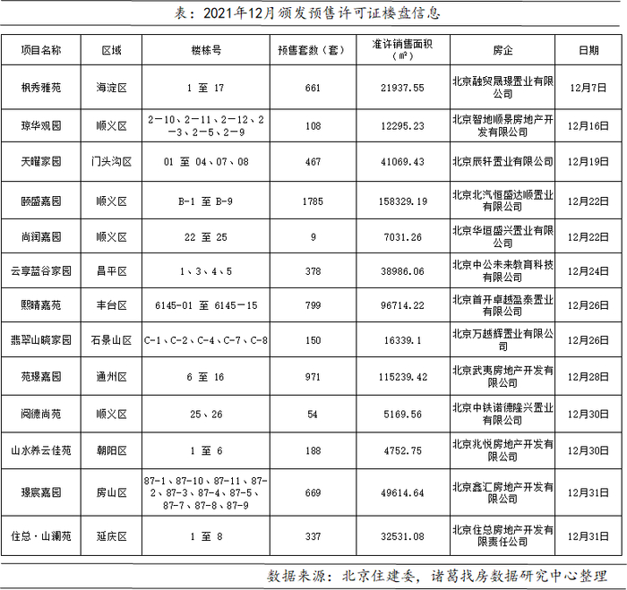 从接下来入市房源来看,2022年1月预计将会有10个左右项目入市,结合2021年最后一个月的取证情况来看,预计顺义区加推力度较大,其中不乏高性价比房源,如阅德尚苑项目,该项目位于顺义中央别墅区,推出220-320㎡叠拼和合院,最低总价在1200万左右,属于限竞房项目,商业配套有祥云小镇、龙湾商街、欧陆购物中心等,教育、医疗资源也相对丰富。从区域选择来看,房山区良乡板块随着区域规划利好逐步兑现、交通配套等不断完善,吸引一众品牌房企入驻开发,同时随着良乡大学城的建设,板块楼市活力逐渐提升,另外,良乡板块基本处于北京近郊区域的价格洼地,引来刚需客群聚集,当前成交均价为28162元/㎡,如12月申领预售证的璟宸嘉园项目,主推户型建面约97-149㎡。
