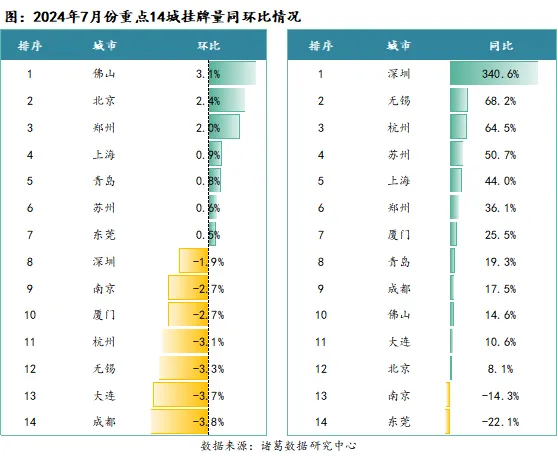 2、根据诸葛数据研究中心监测数据显示,2024年7月监测14个重点城市二手住宅挂牌量229万套,环比上升0.8%,同比上升33.2%。7月监测的城市的整体挂牌量由升转跌,在去库存政策基调下,二手房挂牌量高位回落,边际改善。
