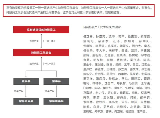 任正非虽然只有公司0.73%的分红权,但拥有较大的表决权,尤其是在股东会层面。但公司董事会、监事会,是由115名持股员工代表“一人一票”选举出来的。