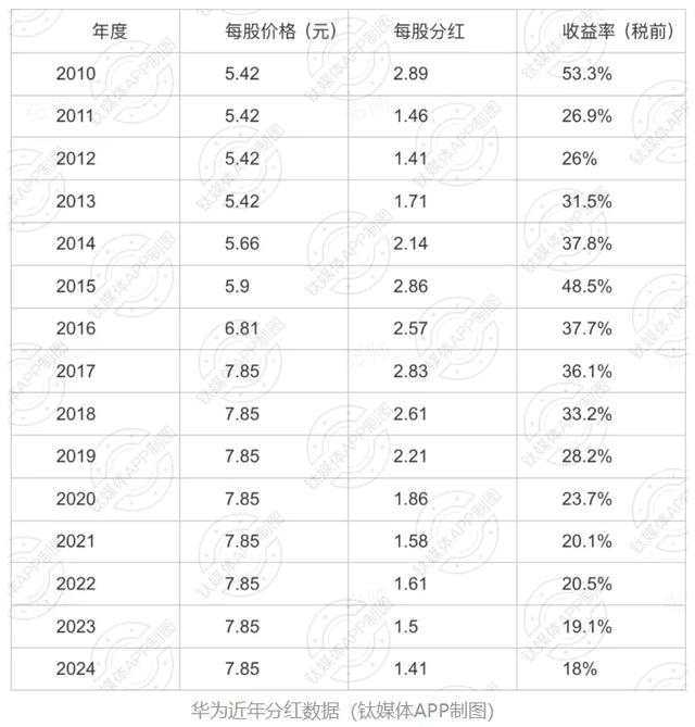 下图是“钛媒体”整理的,华为历年的分红情况。
