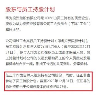 下面截图来自华为2023年年度报告,任正非大约持有华为公司总股本的0.73%。
