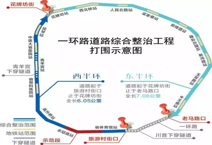 一环路地铁站点市政配套项目年内即将完成的建设任务,主要包括一环路西半环地铁5号线沿线6个站点,分别为西北桥站、花牌坊站、抚琴站、中医大省医院站、青羊宫站、省骨科医院站。