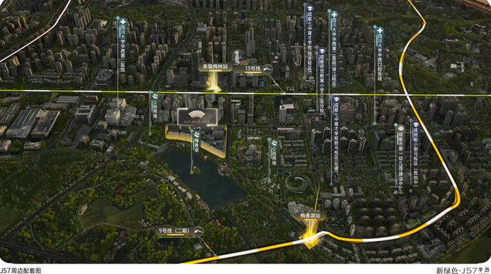 生态有即将升级的梅香湖公园、三圣乡,商业有528、桌锦曼购、锦官花城(建设中),教育有成师附小、七中育才(在建中),医疗更是三大华西在营,地铁有刚刚开通运营的地铁13号线。