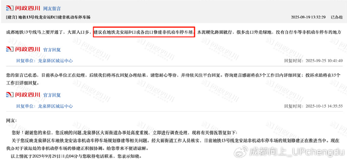 你看地铁还没开通,沿线居民就在呼吁官方修建非机动车停车场,值得点赞的是,龙安站非机动车停车场的规划修建正在推进当中。