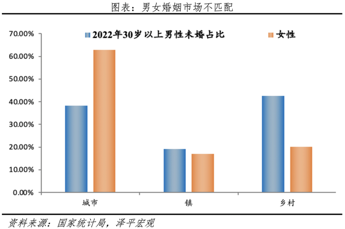 适婚人口男多女少,婚姻匹配困难。男女比例失衡。比如00后男女性别比约115,男性比女性多超1100万,90后男女性别比约110,男性比女性多近900万。2020年第七次全国人口普查数据显示,20-40岁男性人口比女性多1752万人。农村“剩男”和城市“大龄剩女”问题突出。2022年,中国30岁及以上未婚男性有超过60%分布在村镇、一般为较低学历;未婚女性有超过60%分布在城市、一般学历较高。