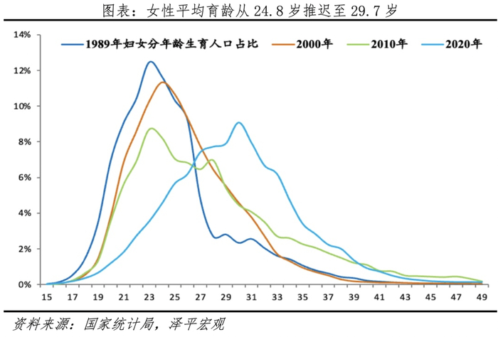 晚婚导致晚育现象加剧,初育年龄每推迟一个月,总和生育率下降8%左右。“婚都不结了,怎么生孩子”。当前,中国绝大部分是婚内生育,非婚生育占比较低,所以结婚数量的减少直接影响生育水平。1990-2020年男性平均初婚年龄从23.6岁推迟至29.4岁,女性平均初婚年龄从22.0岁推迟到28岁;其中,女性、男性平均初婚年龄分别在1996、1998年超过晚婚年龄(女23岁、男25岁)。1990-2020年女性平均初育年龄从24.1岁推迟至27.9岁,平均生育年龄(所有孩次)从24.8岁推迟至29.7岁。并且,1990-2020年30岁及以上高龄产妇的生育一孩数占比从4.6%增至近29.8%,生育子女数占比14.0%增至45.4%。从2020年人口普查数据看,生育一孩、二孩、三孩及以上的平均年龄分别为27.5、30.3、31.6岁。2023年总和生育率仅1左右,不足更替水平的一半。