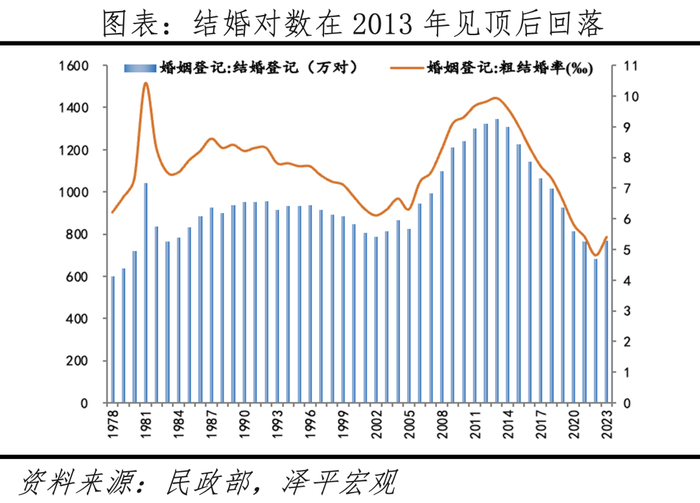 一是结婚登记对数不断创新低,10年内下降49.3%,2023年补偿性结婚需求释放,预计2024年结婚对数创近40年来的新低。2013-2022年,我国结婚登记对数从1346.9万对的历史高点持续下滑至683.5万对,降幅49.3%,2023年结婚登记对数768.2万对,同比增长12.4%,主因疫情后补偿性结婚需求释放。2024年前三季度,全国结婚登记474.7万对,同比减少94.3万对,说明补偿性需求基本结束。参考近十年,前三季度结婚登记对数全年占比在72%-79%,可以估算出2024年全年结婚登记对数在601万对-659万对之间,即使最高值也是近40年来的新低。2013-2022年粗结婚率从9.9‰降至4.8‰,2023年升至5.4‰。